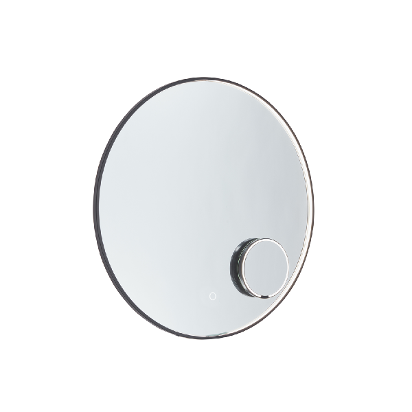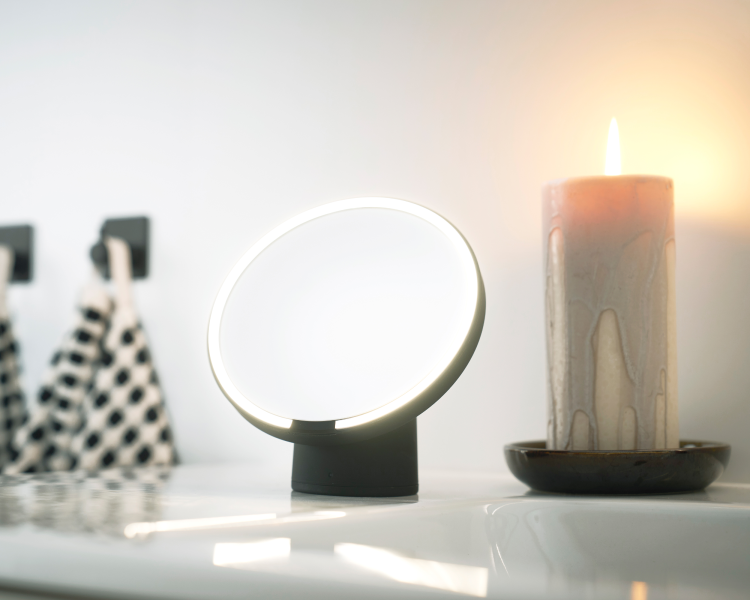 Den perfekte kombinasjonen for din daglige rutine: Loop veggspeil med svart ramme og Vanity forstørrelsesspeil utfyller hverandre og gir deg både den kompakte presisjonen fra forstørrelsesspeilet og den generøse speilflaten samt det elegante designet fra det belyste veggspeilet. Belysning foran langs rammen og en ambilight bakgrunnsbelysning. Størrelser: ø60 og ø80 cm. Vanity sminkespeil inkludert. Plasseres og lades på speilet eller på medfølgende stativ. Les mer om