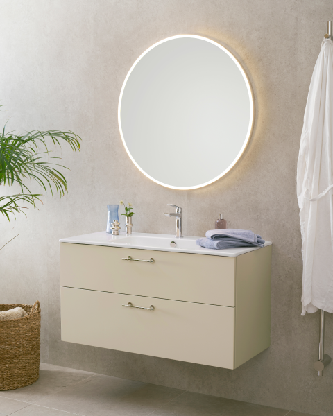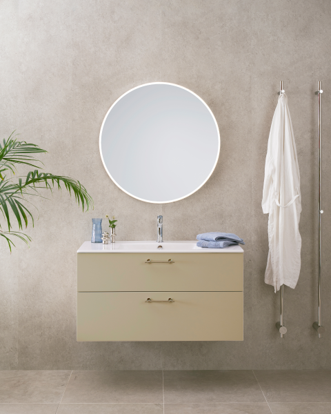 Et moderne speil med Ghostlight for et rent, sømløst utseende. Ghostlight. Skjult belysning gjennom speilflaten. Bevegelsessensor med automatisk avstenging (valgfri funksjon). Antiduggfunksjon. Varmeplate som gir et duggfritt område. Ramme: Krom. Størrelser: ø60, ø80 og ø100 cm. Les mer om